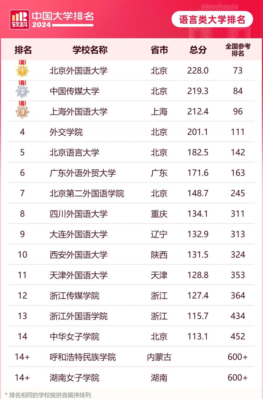 2024软科中国语言类大学排名的上榜高校有16所,北京外国语大学、中国传媒大学、上海外国语大学位列前三。