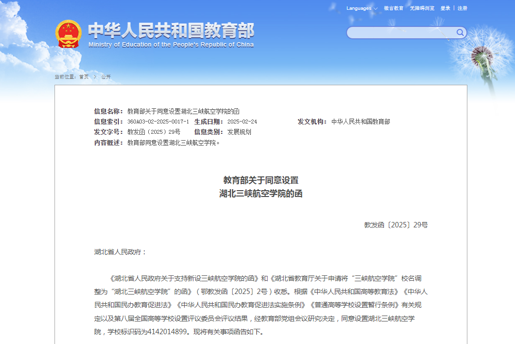 《湖北省人民政府关于支持新设三峡航空学院的函》和《湖北省教育厅关于申请将“三峡航空学院”校名调整为“湖北三峡航空学院”的函》(鄂教发函〔2025〕2号)收悉。根据《中华人民共和国高等教育法》《中华人民共和国民办教育促进法》《中华人民共和国民办教育促进法实施条例》《普通高等学校设置暂行条例》有关规定以及第八届全国高等学校设置评议委员会评议结果,经教育部党组会议研究决定,同意设置湖北三峡航空学院,学校标识码为4142014899。现将有关事项函告如下。